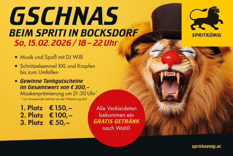 Am 15. Februar verwandelt sich die Spritkönig-Tankstelle in Bocksdorf von 18 bis 22 Uhr zur Faschingslocation mit DJ, gutem Essen, Maskenprämierung, tollen Gewinnen und gratis Getränk für alle Verkleideten.
