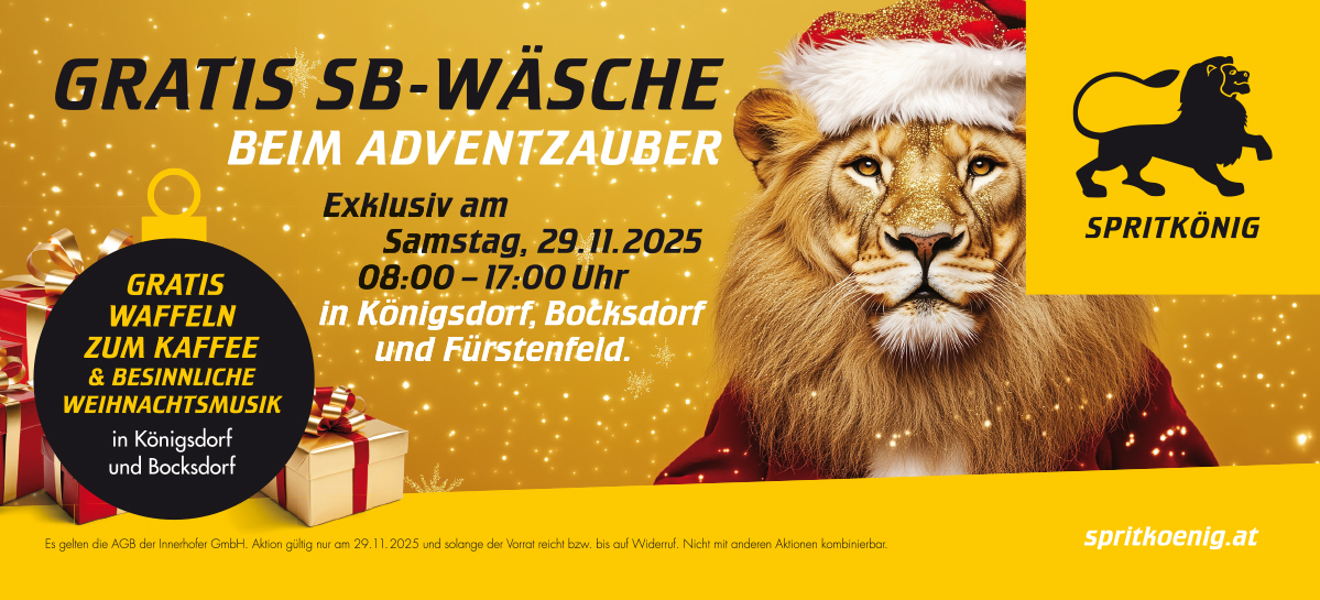 Am 29. November 2025 lädt Spritkönig von 08:00 bis 17:00 Uhr zu einem besonderen Adventangebot an den Standorten Königsdorf, Bocksdorf & Fürstenfeld ein.
